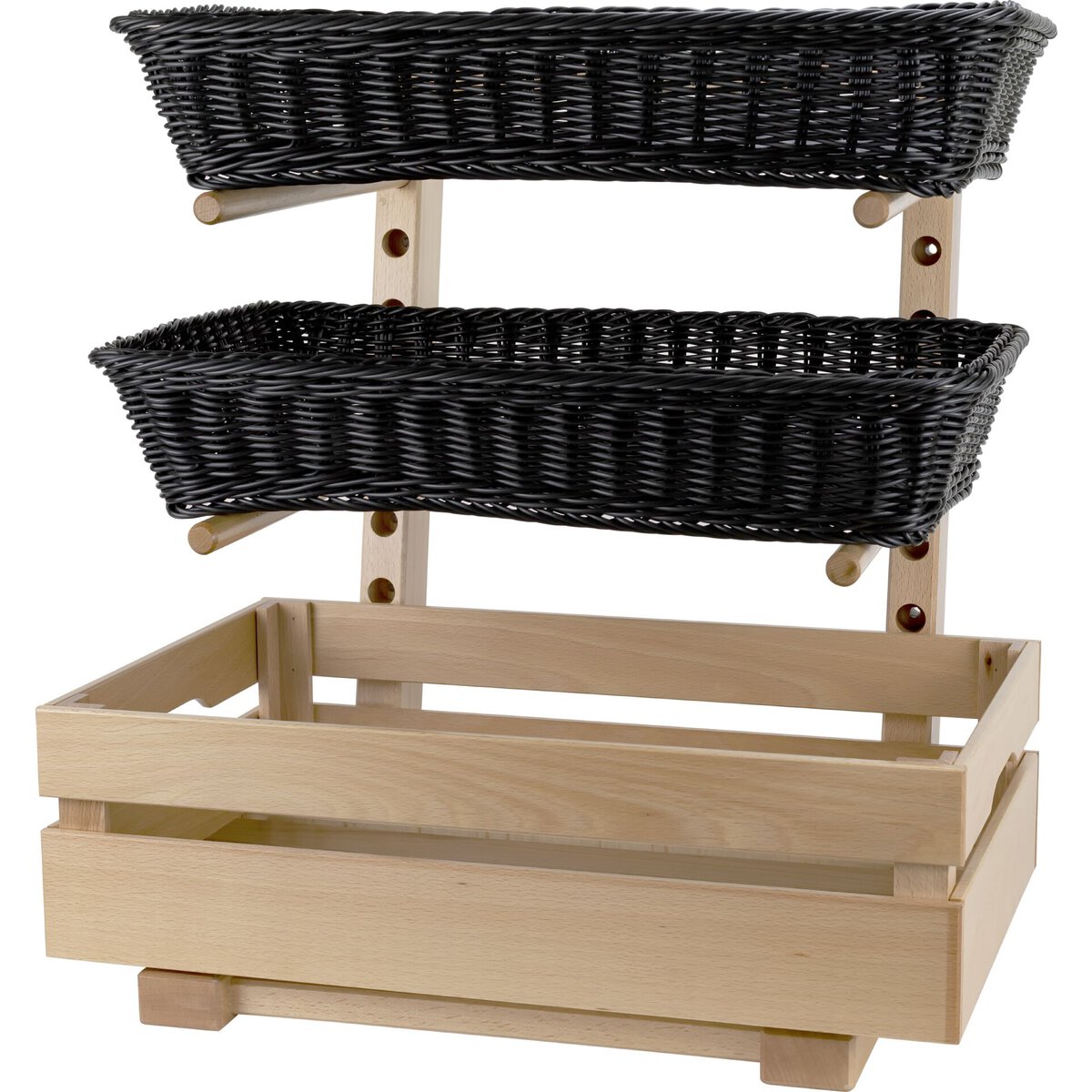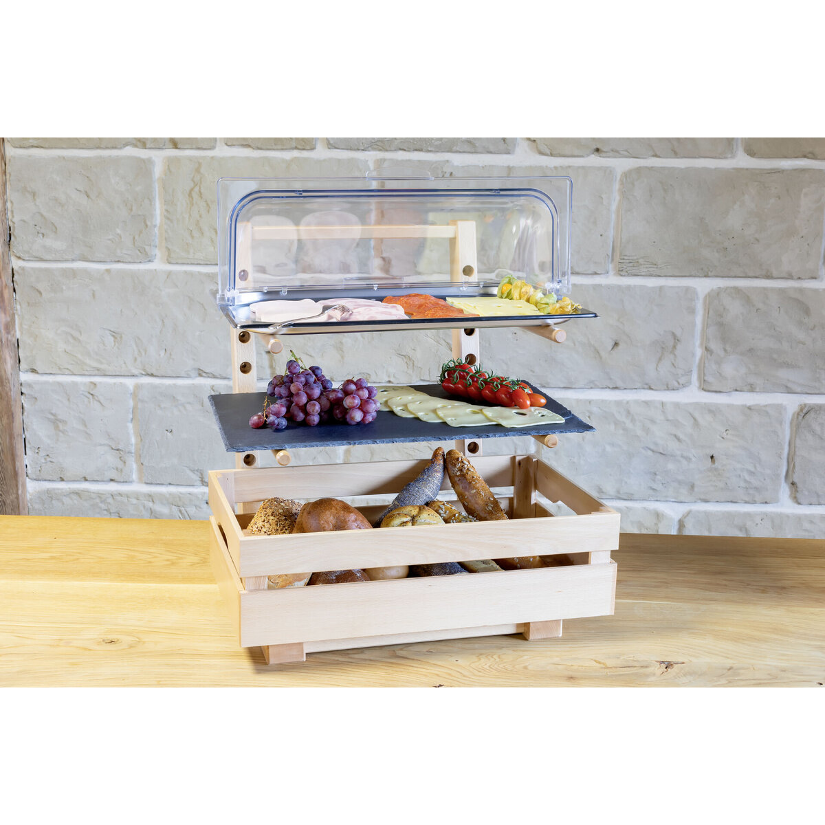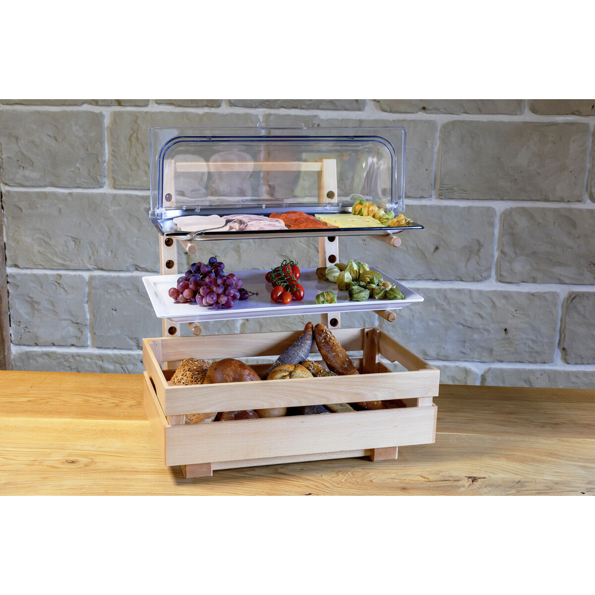 Buffetständer aus Buchenholz. Lebensmittelecht versiegelt, um Verschmutzung zu verhindern und eine bessere Reinigung zu gewährleisten. Nicht spülmaschinengeeignet! Lieferumfang: Ständer, vier Rundhölzer und Befestigungschrauben. LxBxH: 43,5x46x58cm. Maße der Stäbe: Ø 1,8cm, Länge 38cm. Hierzu passende Holzbox (Art.: 15256) separat erhältlich.
