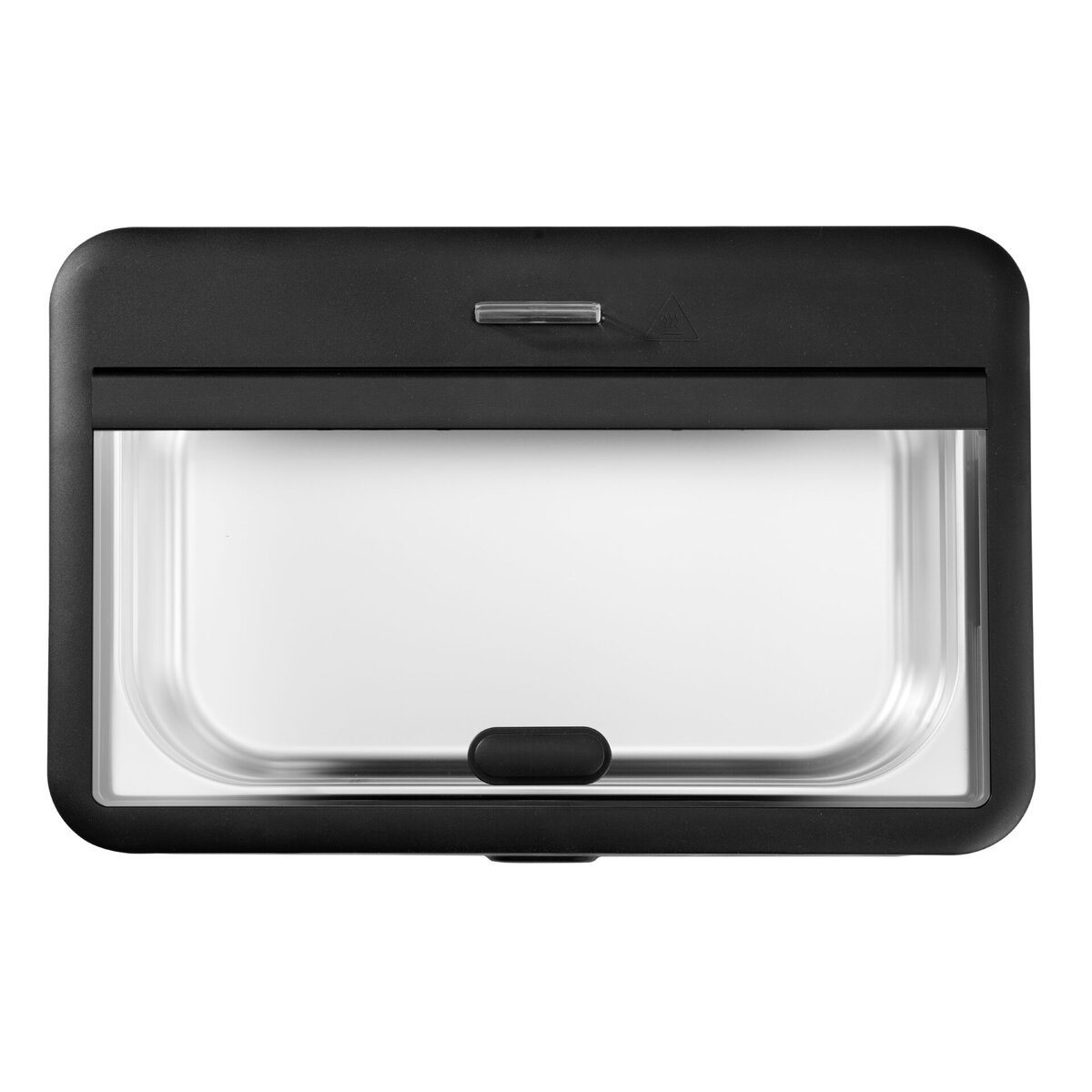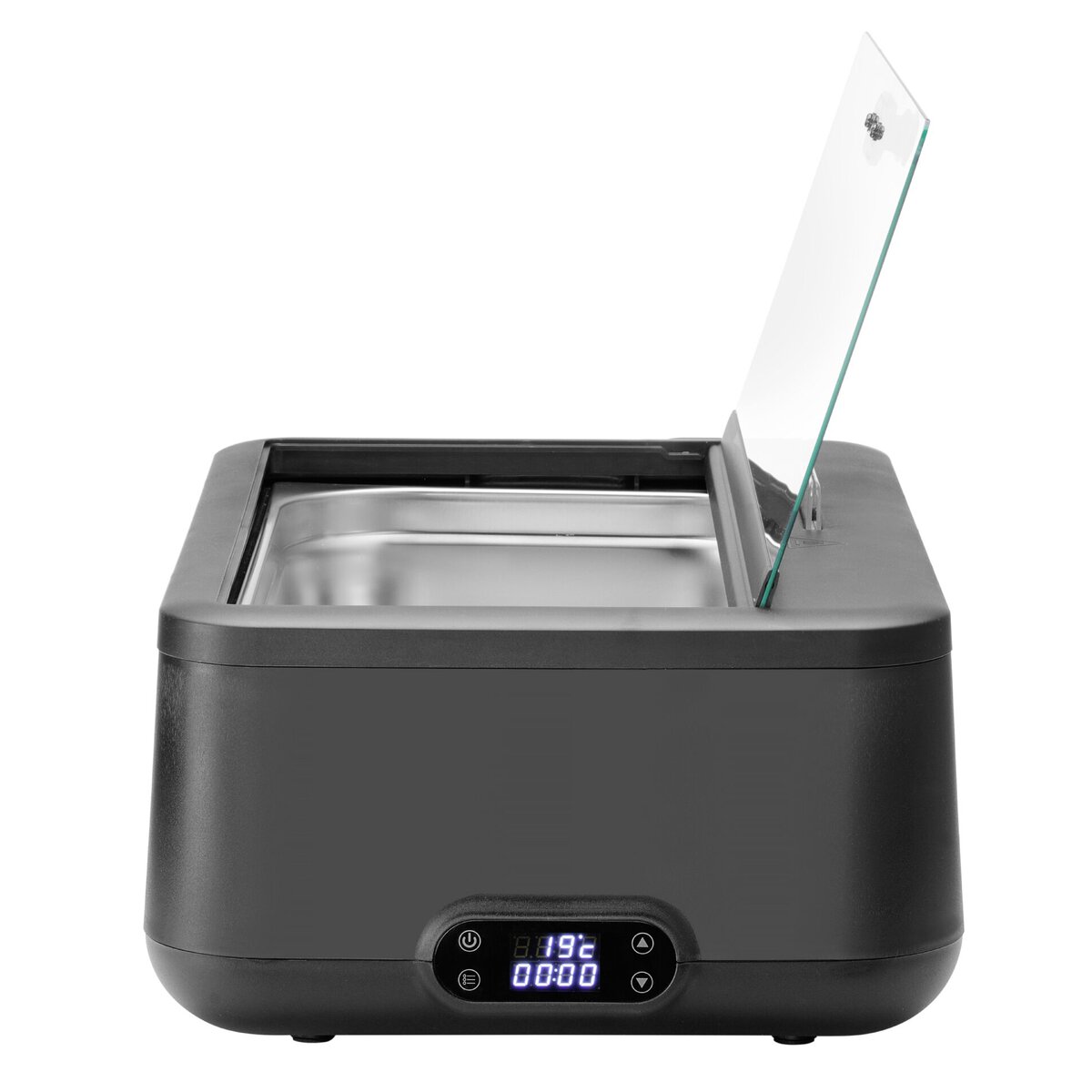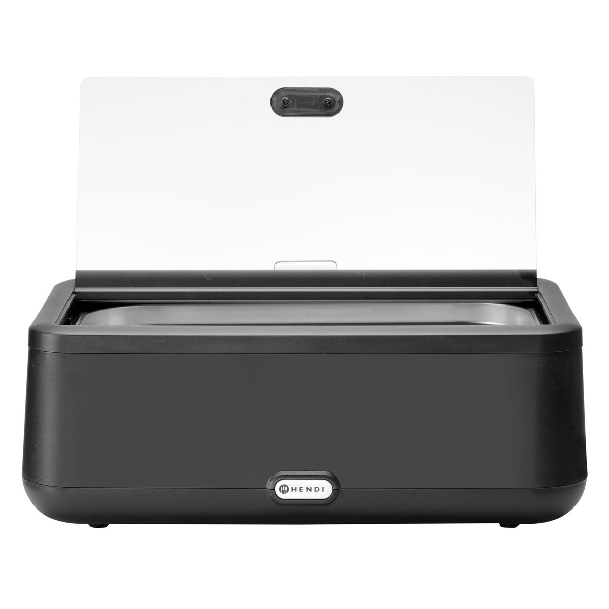 Chafing Dish "Uniq". Gehäuse aus PP. Herausnehmbarer GN1/1 Behälter (H:100mm) aus AISI 304 Edelstahl inklusive. Heizelement aus Edelstahl AISI 304, das für eine effiziente Wärmeübertragung in den Wasserbehälter sorgt. Gehärteter Glasdeckel mit isoliertem Griff, Pfannenkerbe und Aluminiumscharnier. Integrierter Kartenhalter am Deckel für die Speisenbezeichnungen. Das empfindliche Wassersensormodul erinnert den Benutzer daran, wann es Zeit ist, den Wasserbehälter nachzufüllen und verhindert so ein Trockensieden. Digitales Bedienfeld mit Anzeige der Gesamtbetriebszeit, der eingestellten Temperatur und der tatsächlichen Temperatur. Die letzte Temperatureinstellung wird im Speicher registriert und jedes Mal ausgewählt, wenn die Stromversorgung eingeschaltet wird. Die Temperatur kann von 35 bis 85°C in Schritten von 1°C eingestellt werden. Maximalfülllinie ±4 Liter. Nicht zum Kochen bestimmt, nur zum Warmhalten.