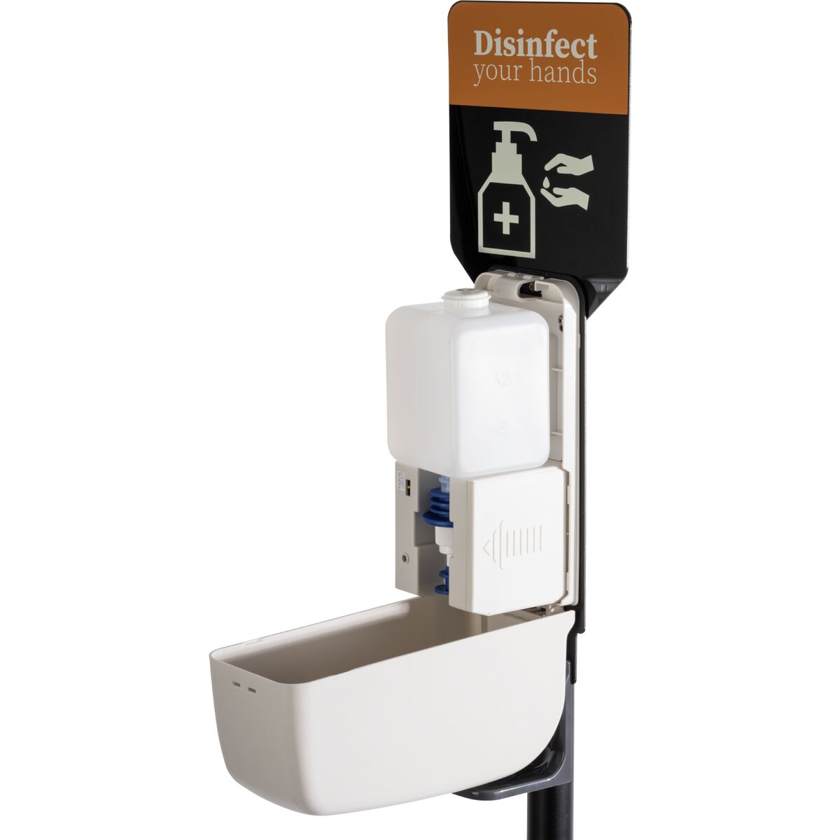 Desinfektionsständer zur berührungslosen Handdesinfektion. Metall, schwarz, Kunststoff mit Sensor, schwerer Standfuß Ø 32 cm, inkl. Informationstafel, Fassungsvermögen: ca. 1 Liter. Nicht enthalten: Desinfektionsmittel und Batterien (benötigt werden 4 Stk. Typ C-LR14).