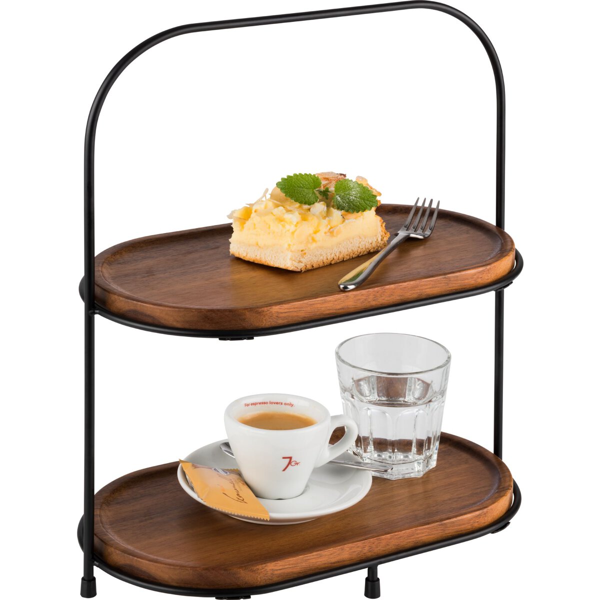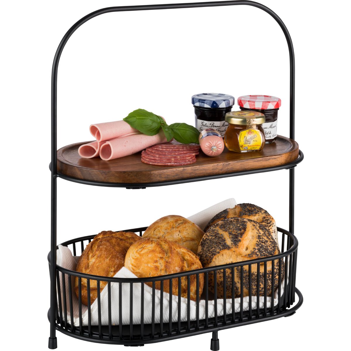Zweistufige Etagere "All-Rounder" bestehend aus einem schwarzen Metallgestell mit Antirutschfüßchen, zwei schwarzen Metallkörben (je 29x16x7 cm) und zwei Servierbrettern aus geöltem Akazienholz (je 28,5x15,5x1,5 cm). Nicht spülmaschinengeeignet!