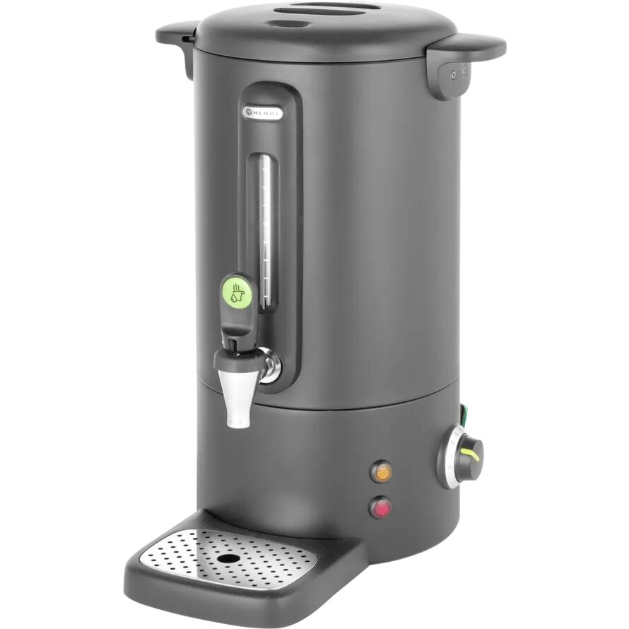 Einwandiges Gehäuse aus Edelstahl. Griffe aus Polypropylen. Tropffreier Wasserhahn. Wasserstandanzeige aus Glas. Die Tropfschale ist mit einem Magnet befestigt und leicht zu reinigen. Thermostat-Anzeige. Maximale Flüssigkeitsstandanzeige im Inneren des Geräts. Die Temperatur kann im Bereich von 30°C bis 100°C eingestellt werden. Maximale Becherhöhe: 10cm. Reset-Taste - zur Verwendung bei Überhitzung. Warnleuchte für Überhitzung oder wenn eine Entkalkung erforderlich ist. Nur zum Kochen von Wasser oder Wein - nicht geeignet für andere Flüssigkeiten wie Milch oder heiße Schokolade.