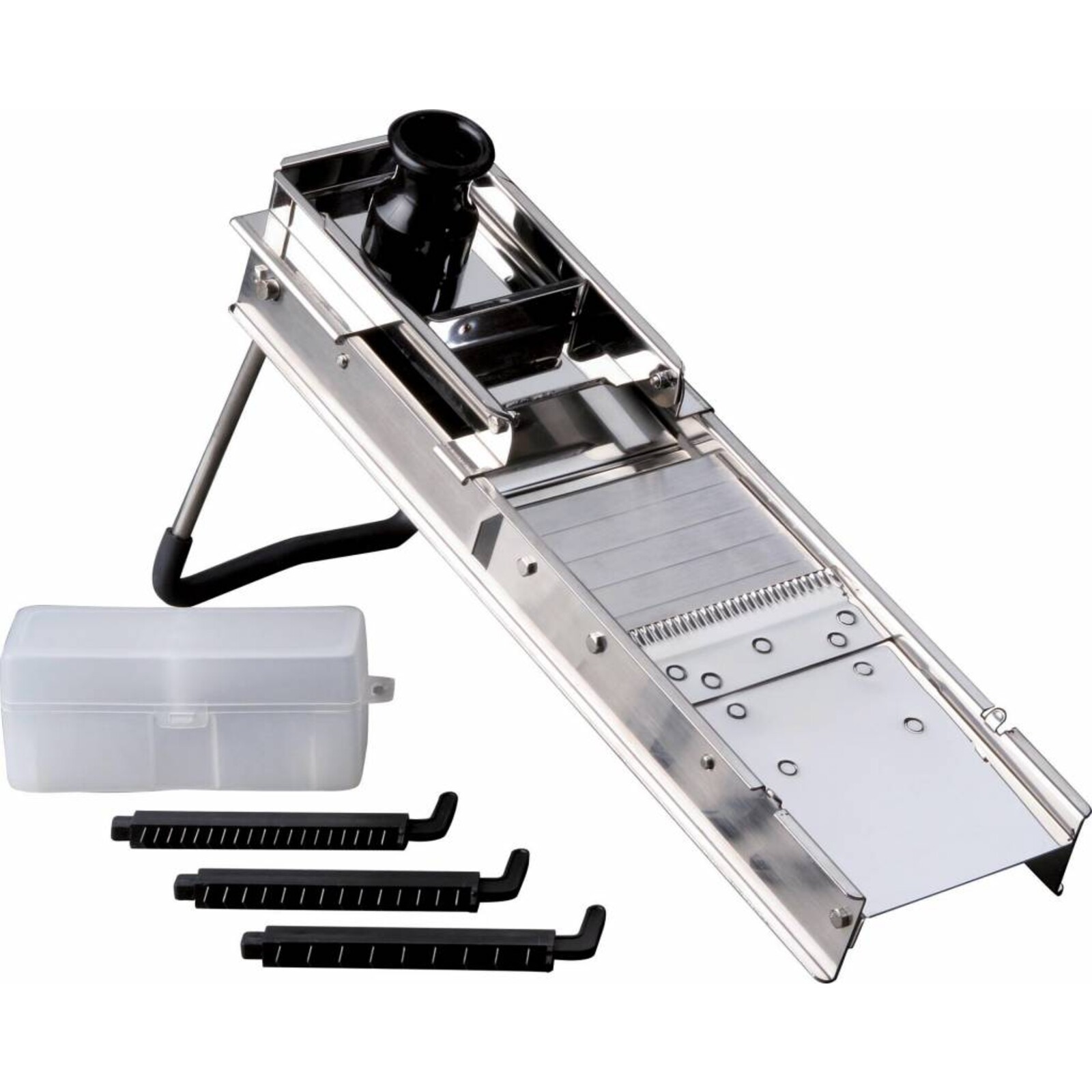 Edelstahl 18/10, rostfrei. Inkl. 3 verschiedener, auswechselbarer Schneidkämme (Streifen mit 4, 6 und 10 mm Breite) und Restehalter. Gewicht in kg: 1,7.