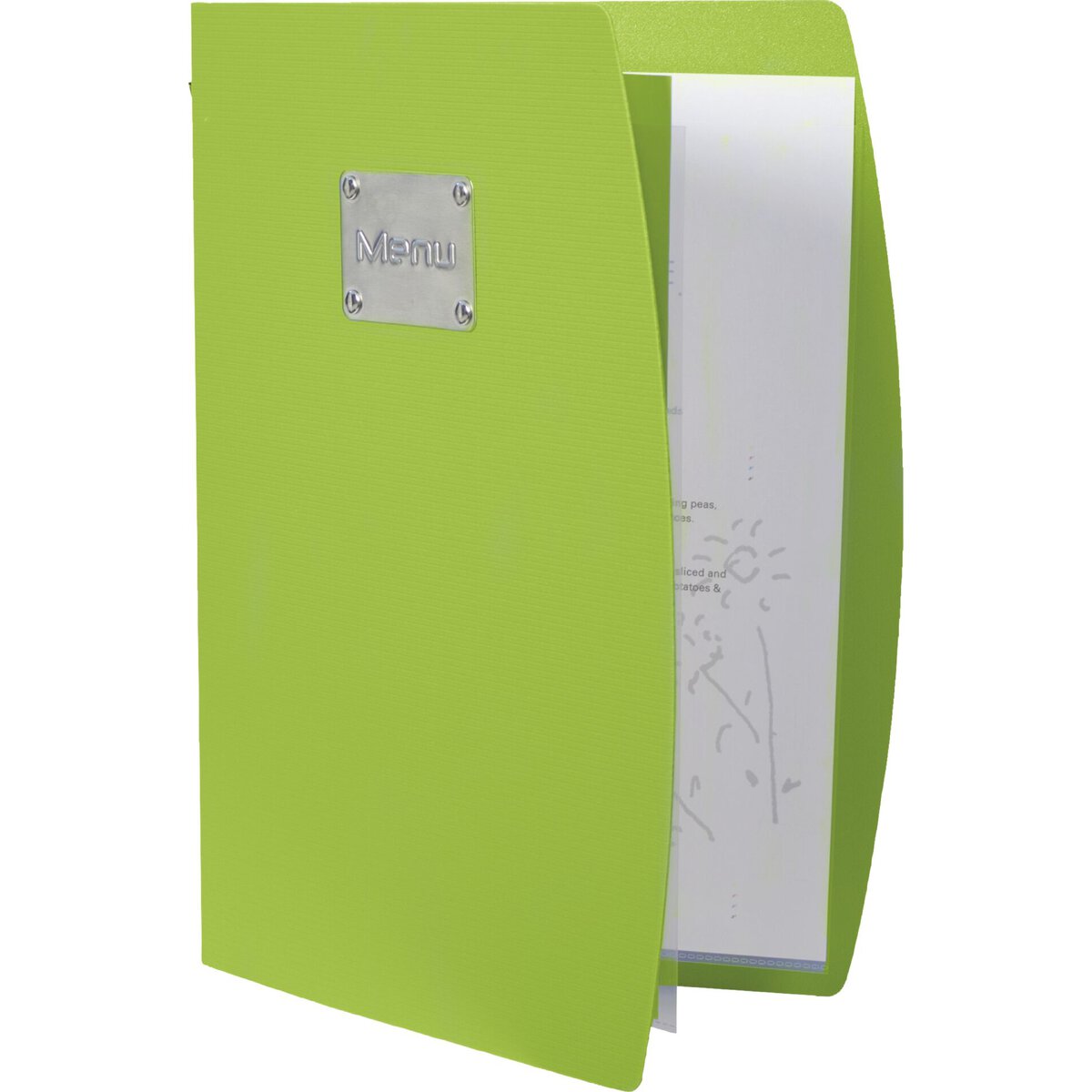 Moderne Strukturkarte aus Kunststoff (PP). Edelstahlschild mit Aufdruck „Menu“, inkl. 1 Doppeleinlage. Für bis zu 10 Einleger geeignet. Heftung: Gummiband mit Doppeleinlage (4 Seiten). Leicht zu reinigen.
