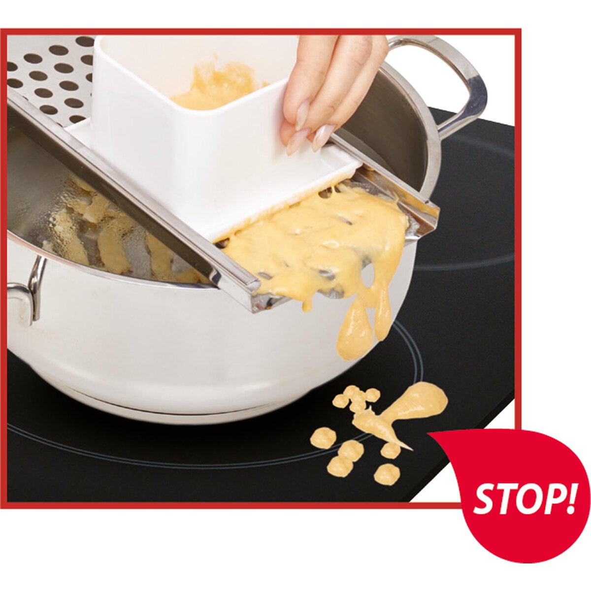 Edelstahl, für die Zubereitung von kurzen Spätzle (Knöpfle), verbesserte, tropffreie Ausführung, stabiler Rahmen mit Griff aus Kunststoff, spülmaschinengeeignet.