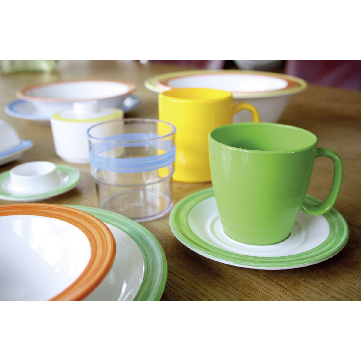 Tassen aus extrem bruchfestem PBT. Leicht, oberflächenhart, geruchs- und geschmacksneutral, recyclebar, mikrowellen- und spülmaschinengeeignet. Hitzebeständig bis 200°C. Dauerhafte Kontakthitze bitte vermeiden!