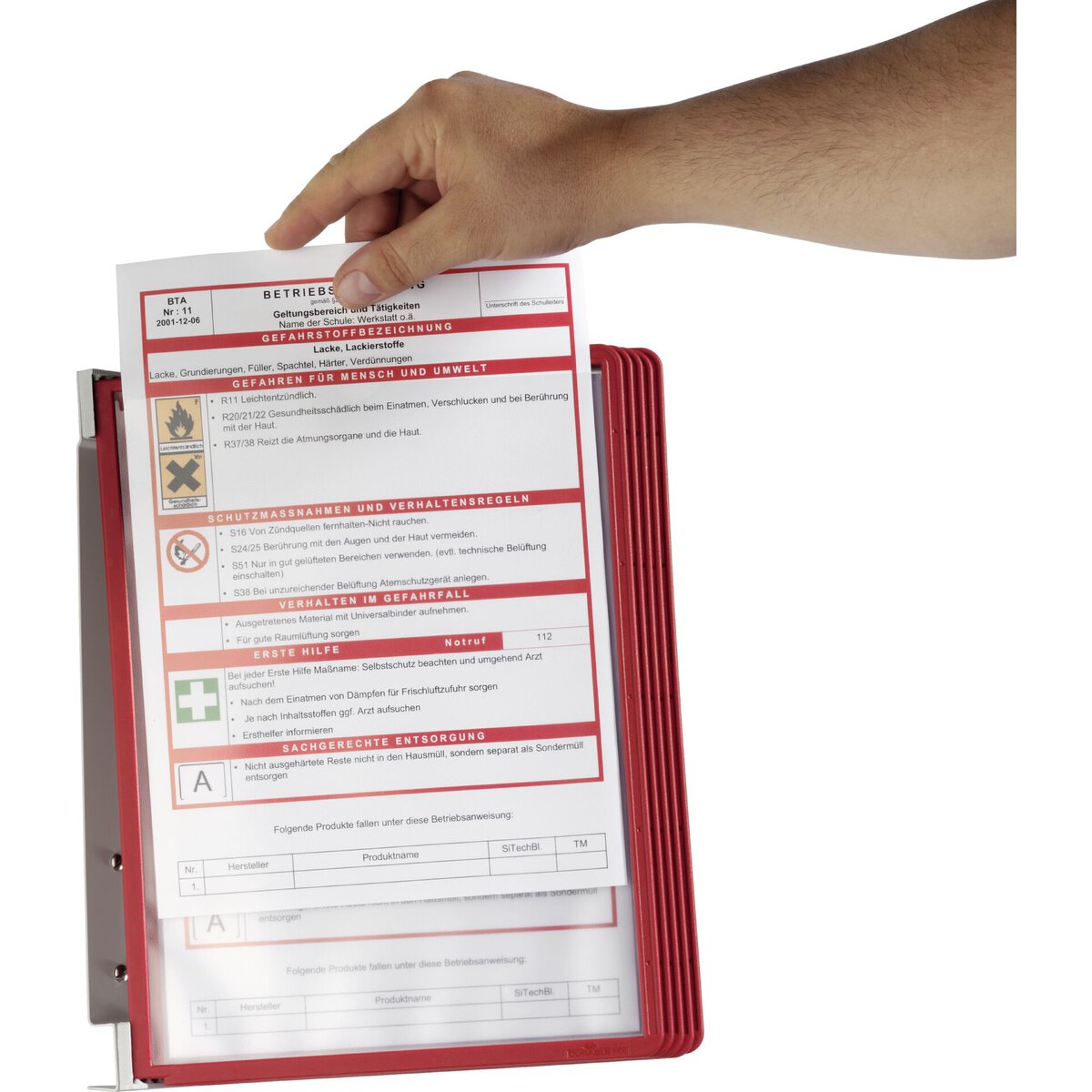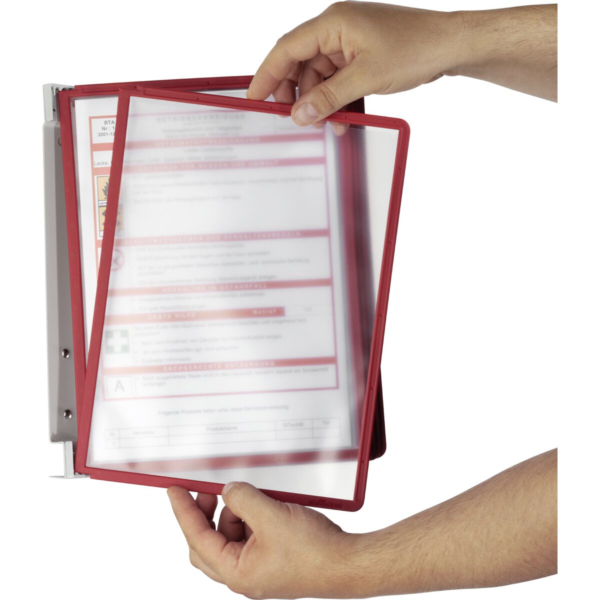 Wandhalter aus Metall mit 5 Sherpa Sichttafeln im Format DIN A4, rot, inkl. Schrauben und Dübel.