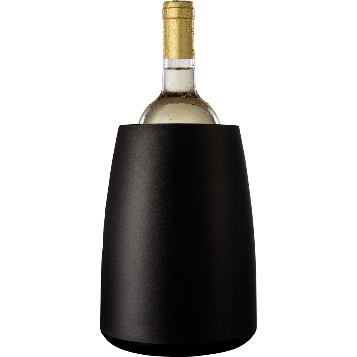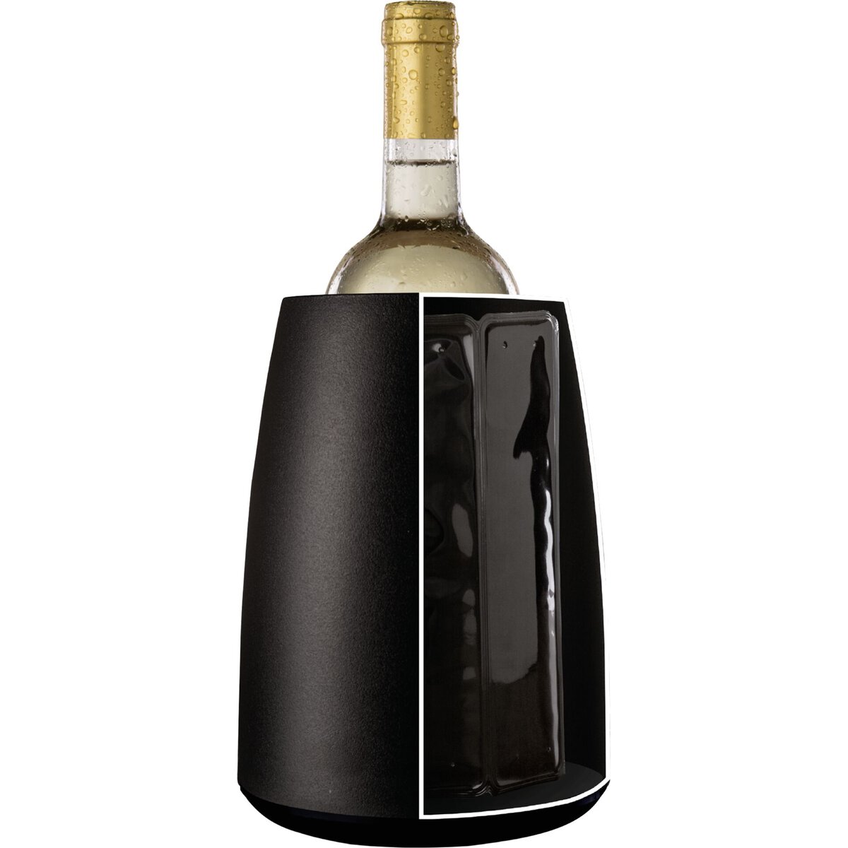 Körper aus ABS. Weinkühler mit wiederverwendbarem Kühlelement. Für Flaschen mit maximal Ø 8 cm. Kühlmanschette im Gefrierfach kühlen. Behälter unten aufdrehen, Manschette einlegen/entnehmen. Ersatzkühlelement dazu Art.Nr. 16665.